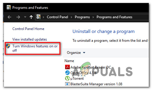 - Once you get inside the Programs and Features screen, click on Turn Windows features on or off from the vertical menu on the left.