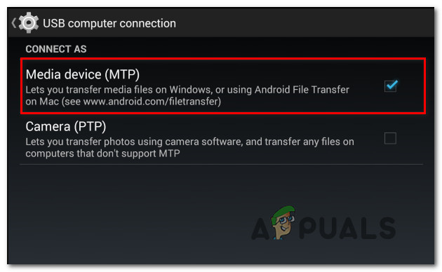 - The transfer protocol is not MTP – If you’re trying to copy files from an Android device, chances are you’re seeing the error because the transfer protocol is not set to MTP. In this case, you should be able to resolve the issue by changing your Android USB connection preferences so that it connects as a Media device.