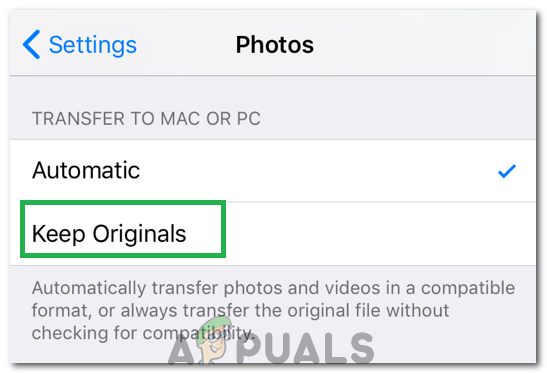 - Click on it and select the “Keep Originals” option instead of the automatic one.