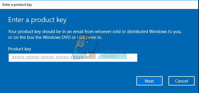 - Paste your new Windows 10 Pro registration Key into the textbox, and click “Next”.