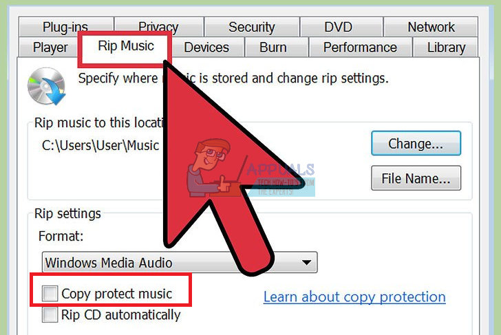 - Navigate to the Rip Music tab and uncheck the box next to the “Copy Protect Music”.