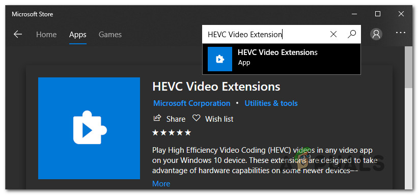 - HEVC Video Extension is not installed – In most cases, this particular issue occurs because the extension required to play certain unique video formats on high-end configurations is not installed on the machine. In this case, you should be able to resolve the issue by installing the HEVC Video Extension app from the Microsoft Store.