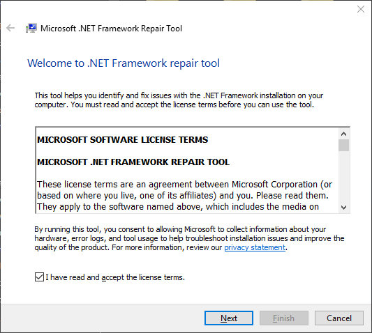 - Once you’re finally inside the Microsoft .NET Framework Repair Tool, follow the on-screen instructions and check the box associated with I have read and accepted the license terms when prompted by the ToS before clicking on Next to move forward.
