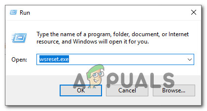 - Press Windows key + R to open up a Run dialog box. Then, type ‘wsreset.exe’ inside the text box and press Enter to run the cache cleaning utility.