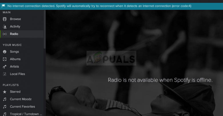 It’s a large problem for casual users who just want the simplest way possible to listen to music on their PC without having to do anything besides clicking the play button. The message which appears along goes like: “No internet connection detected. Spotify will automatically try to reconnect when it detects an internet connection (error code: 4).”