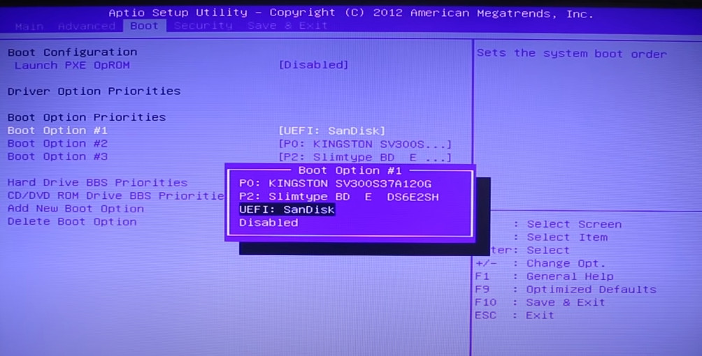 - Inside the Setup menu, access the Boot tab and make sure to set the USB stick containing the installation media as the first boot option.