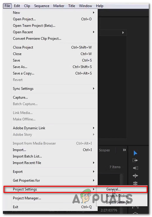 - Inside the video that is throwing the error, click on File from the ribbon menu in the top-left section of the screen. Then, from the File menu, go to Project Settings and click on General.