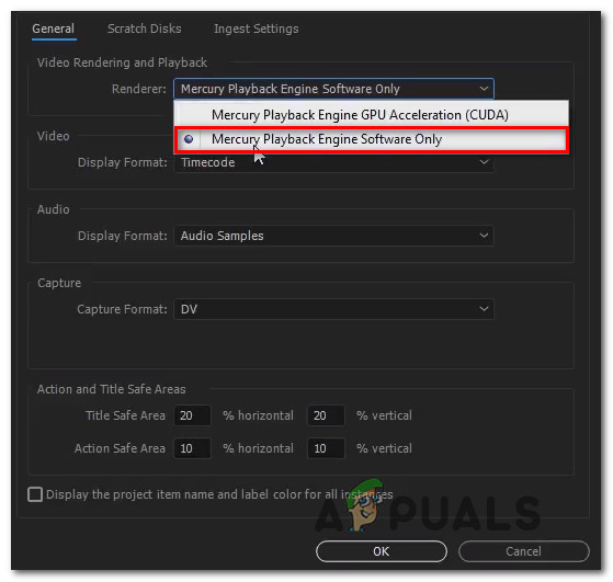 Accessing the General settings option of the current project in Adobe Premiere Pro - Once you’re inside the Project Settings window, make sure the General tab is selected. Then, go to the Video Rendering and Playback and make sure that Mercury Playback Engine Software Only is selected. You can do this by using the drop-down menu.