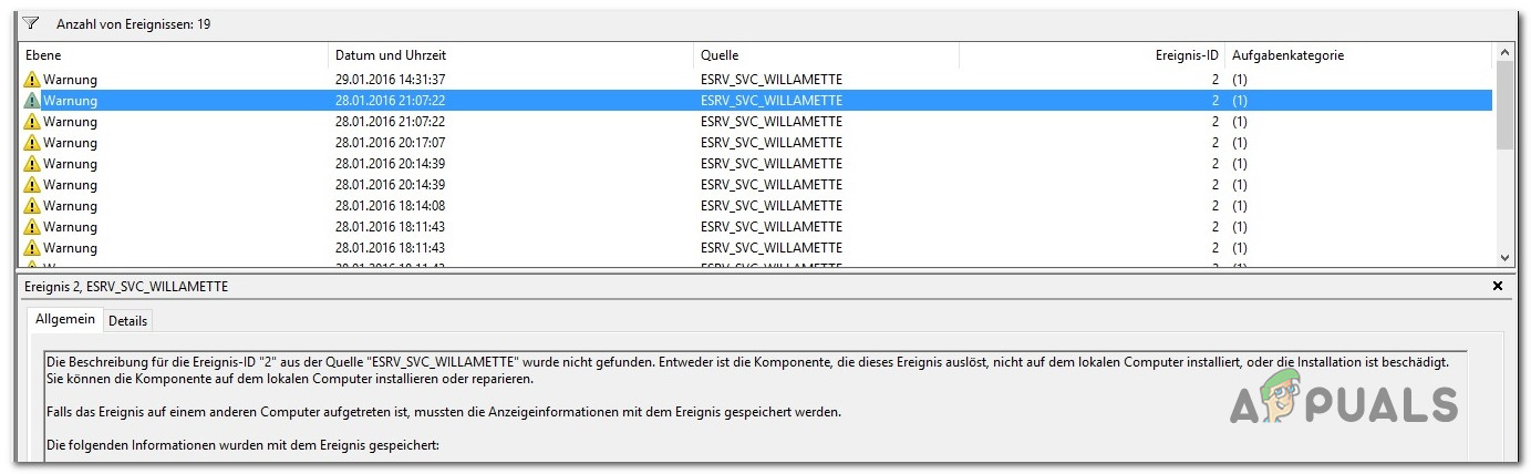Several Windows users have been reaching us with questions after opening Event Viewer and discovering that it’s full of critical errors that can be traced back to the ESRV_SVC_WILLAMETTE component. In most cases, the error explanation says that the ESRV_SVC_WILLAMETTE component cannot be found or is not correctly installed on the local computer. The issue is reported to occur on Windows 7, Windows 8.1 and Windows 10.