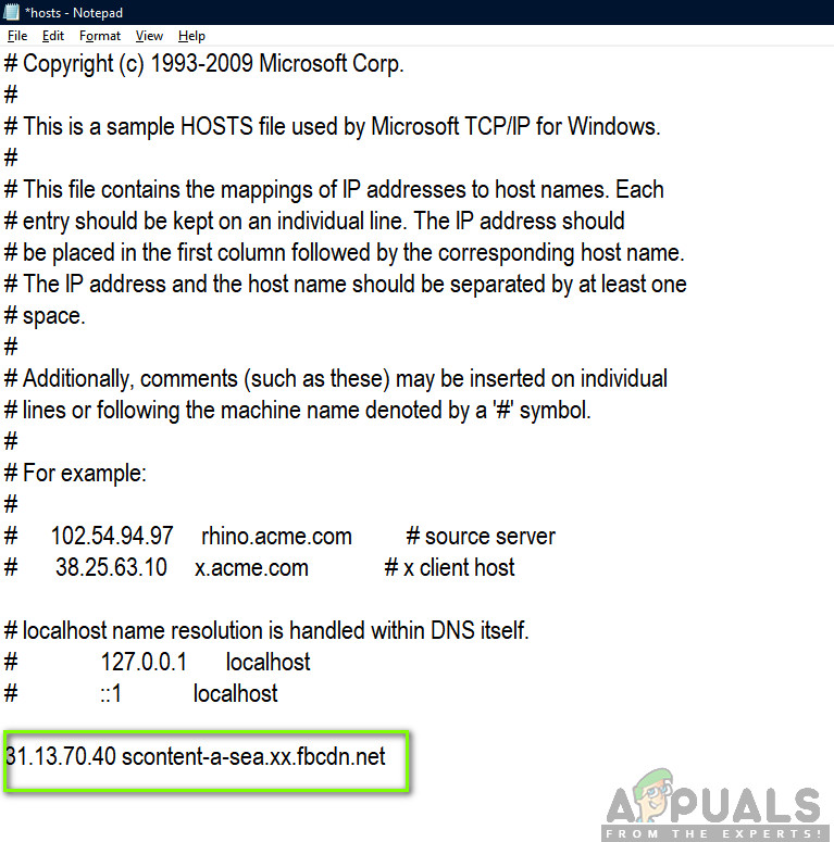 Every computer has a hosts file which allows the mapping of hostnames to IP addresses whenever your computer is connecting to the internet. According to several users, there was a workaround where adding a specific entry manually solved the problem of Facebook images not loading instantly.