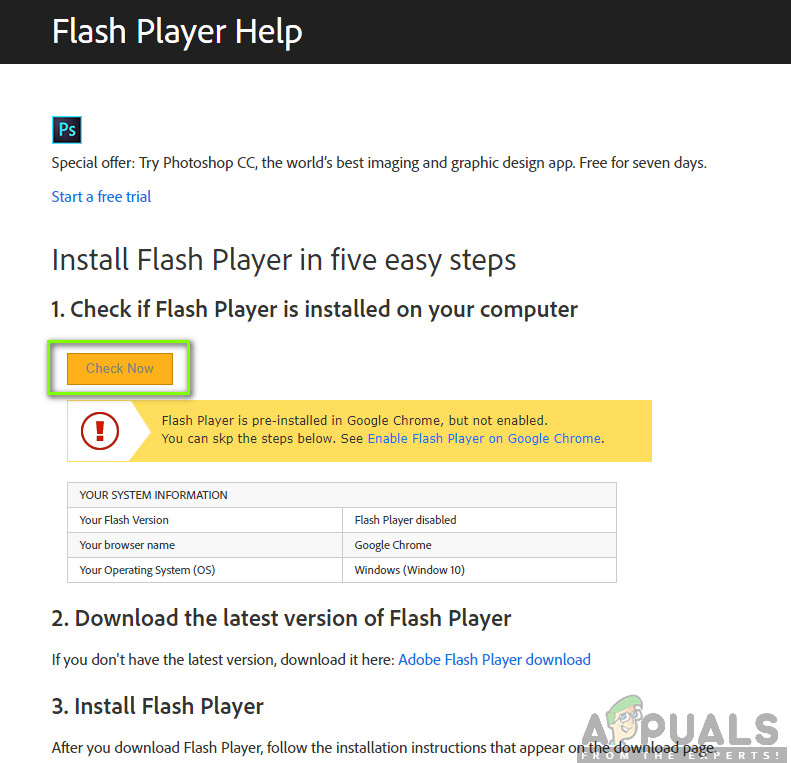 - Navigate to the official website of Adobe Flash. Once on the website, click on Check Now. It will tell you whether you have Flash player installed or not.