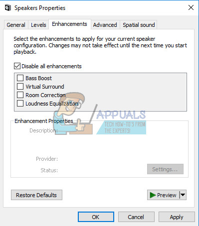 - Click on the Enhancement tab above and check the box labeled Disable all enhancements, and Apply.