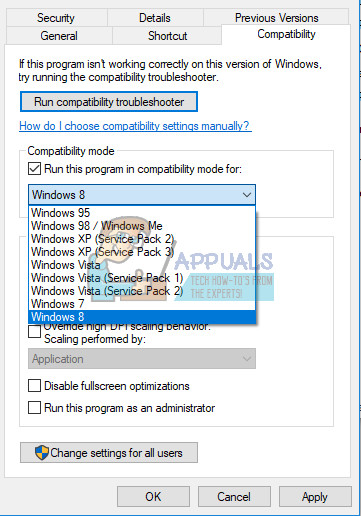 - Check ‘Run this program in compatibility mode for:’ and select the OS (that you found in step 1) from the dropdown box and click OK button.