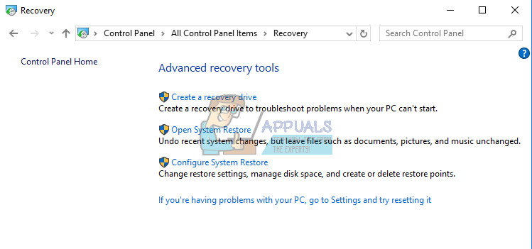 - Navigate to the Recovery menu and select the “Open System Restore” option. Note that you will need to have administrator privileges in order to open this. Be ready to lose everything you installed before the restore point of your choice.