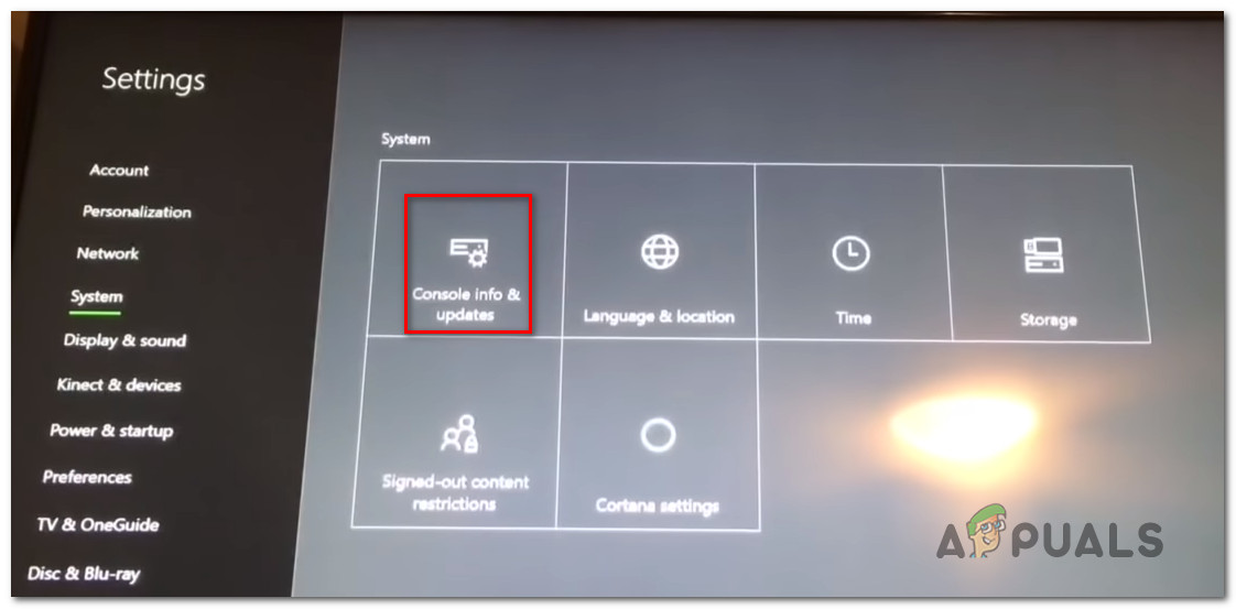 Settings- Xbox - Once you’re inside the Settings menu, select the System tab from the vertical menu on the left, then move over to the right-hand side and select Console info & updates.