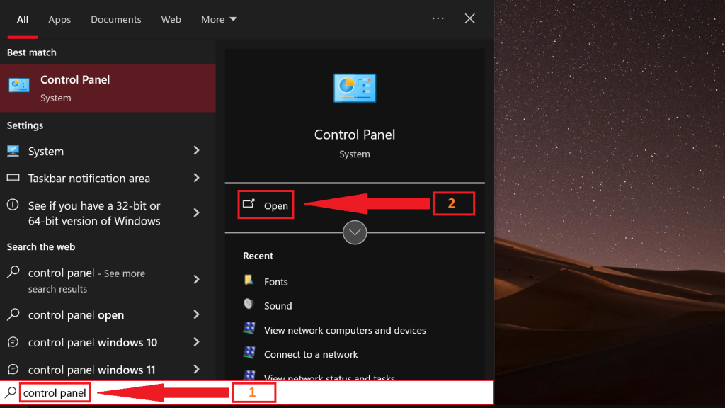 - Search for Control Panel in the Windows search box.
