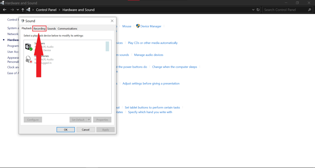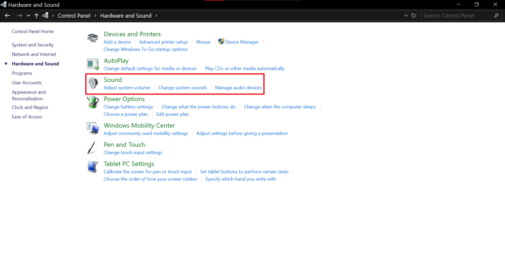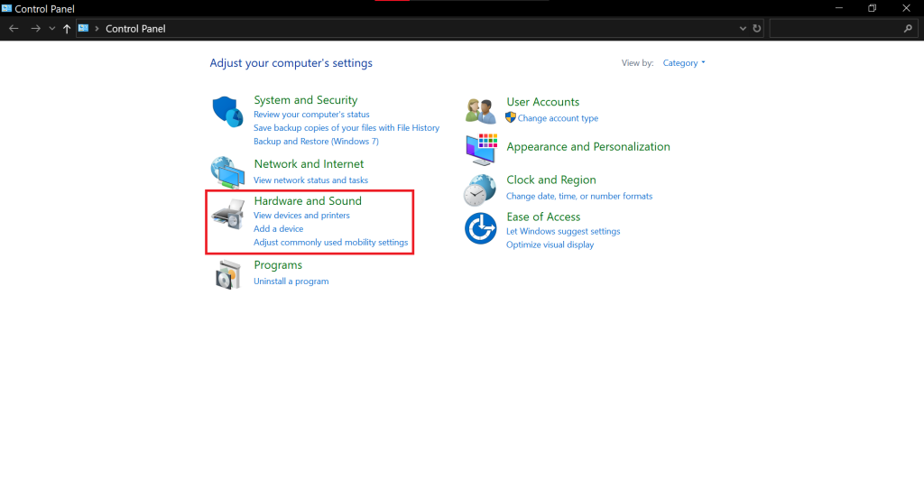 - Select the Hardware and Sound category.