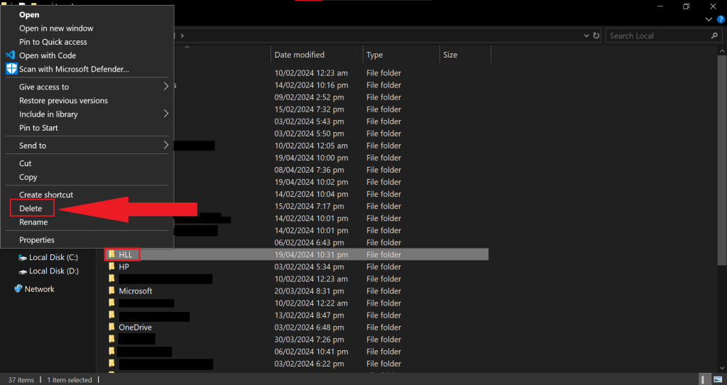 - Locate and right-click the folder named HLL.
