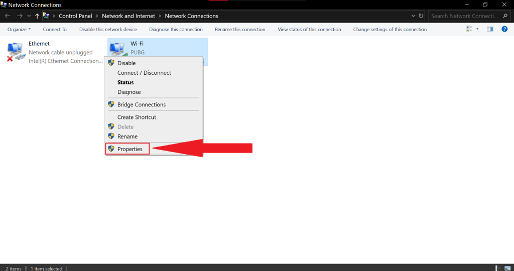 - Right-click on your network connection and choose Properties.