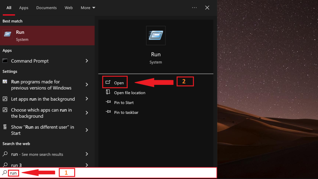 - Search for Run in the Windows search box.