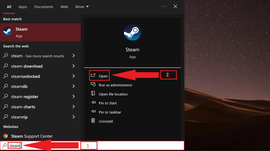 - Search for Steam in the Windows search box.