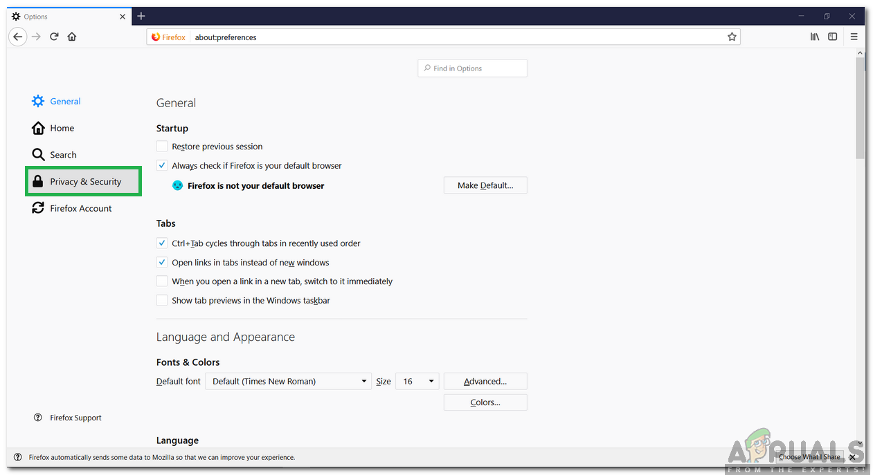 Clicking on the “Privacy and Security” tab - Under the “Cookies and Site Data” click on the “Clear Data” option.