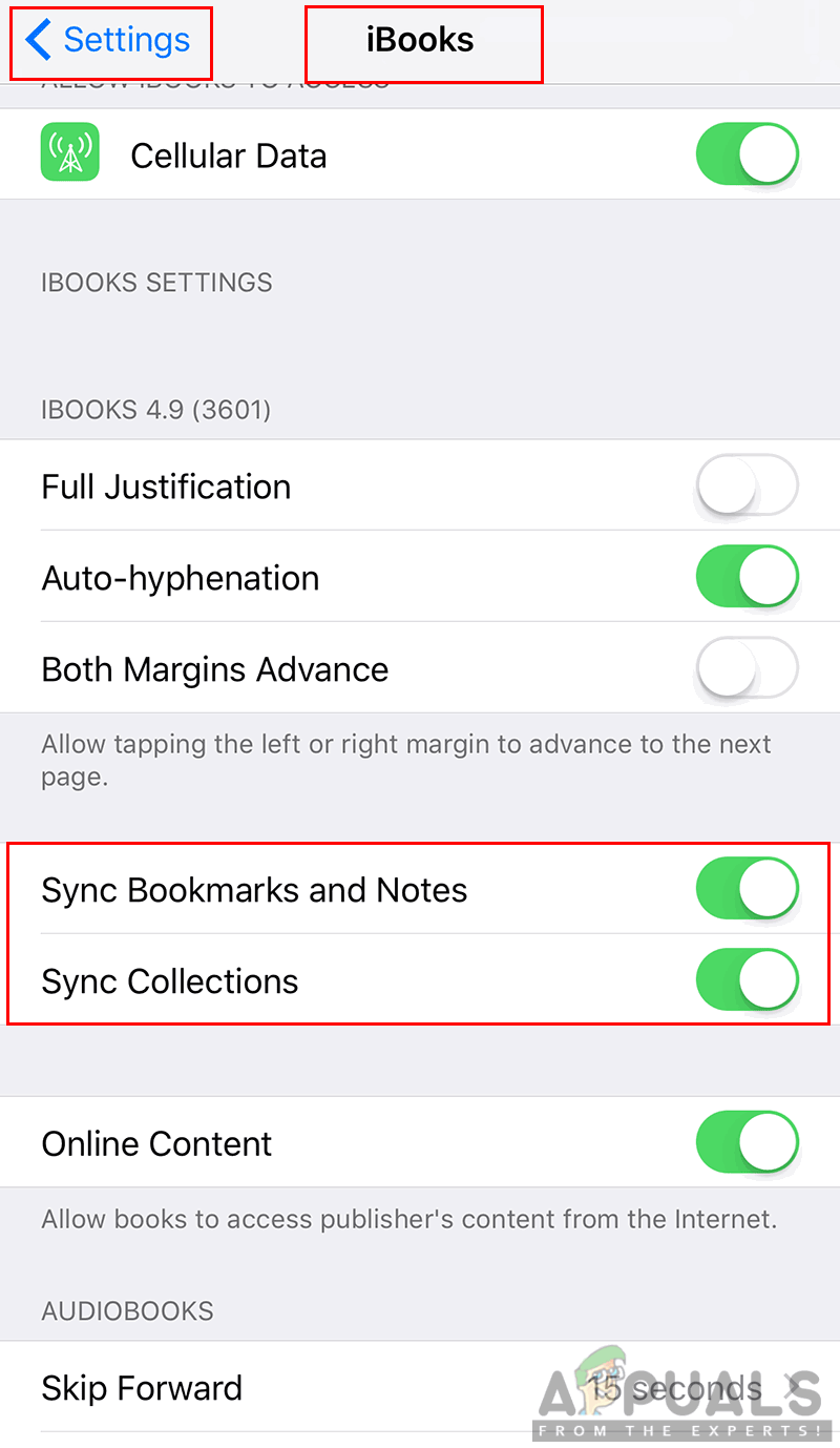 - Open your phone’s Settings, tap on iBooks, and make sure it is turned ON.