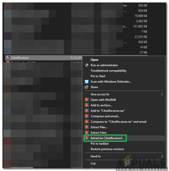 Right-clicking on the “CitrixReceiver.exe” and selecting “Extract to CitrixReceiver/” option. - This will extract the contents of the “.exe” file in a folder named “CitrixReceiver” in the same directory.
