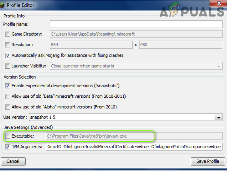 Edit the Java Path in the Minecraft Profile Editor - Now apply your changes & check if the internal exception issue is resolved.
