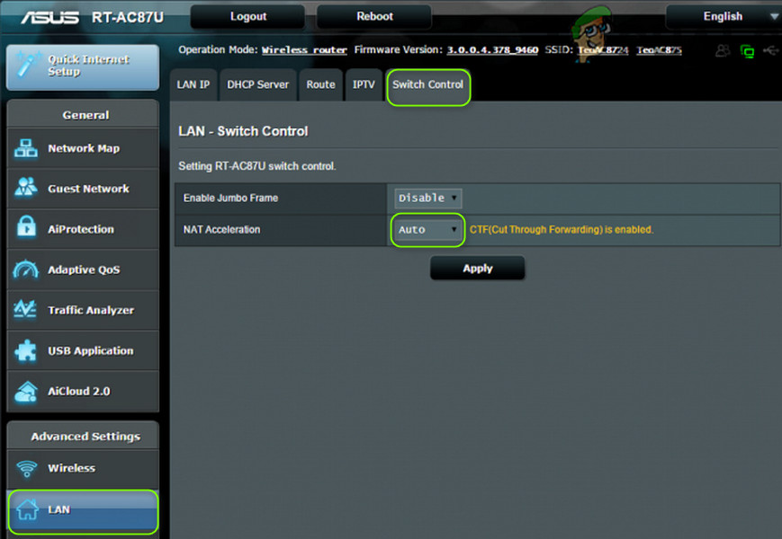 - Now select LAN (in the left pane) & disable Hardware Acceleration in the Switch Control tab. If the Hardware Acceleration (the Asus branded router feature) is not shown, look for it with different names like CTF (Cut-Through Forwarding) & FA (Flow Accelerator).