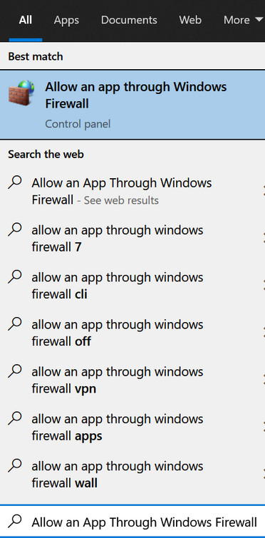 - Click Windows, type: Allow an App Through Windows Firewall, & open it.