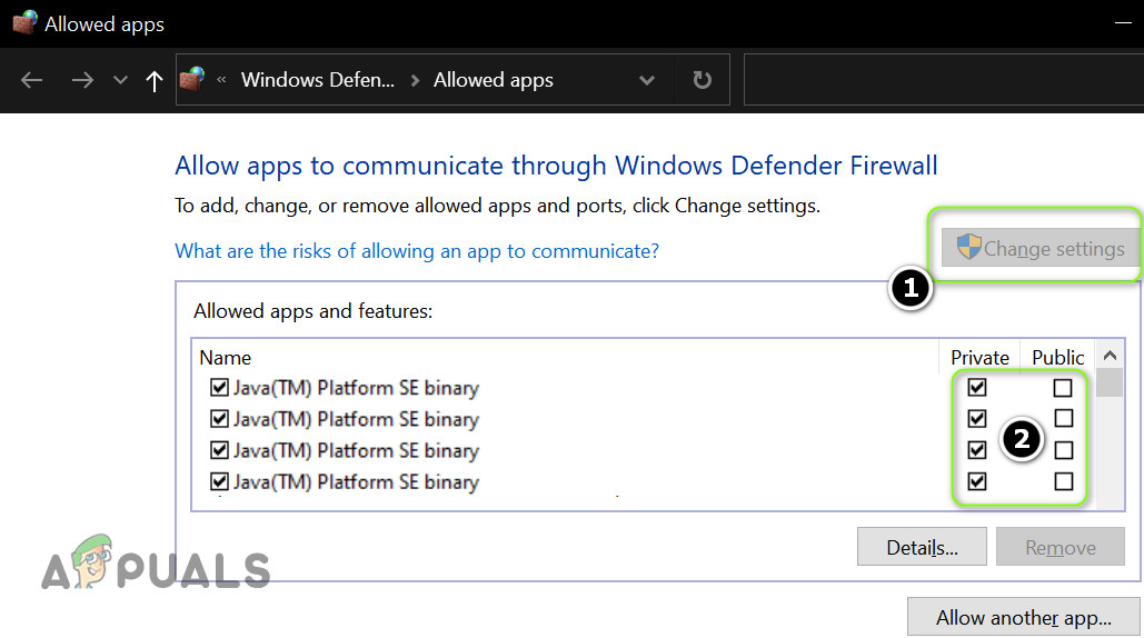 Open Allow an App Through Windows Firewall - Now click on Change Settings & in the list of Apps, find Java (TM) Platform SE Binary. If it is not present, click on Allow Another App & steer to the installation directory of Java (usually, the Java directory of Program Files and Program Files (X86) folders) and double-click on Javaw.exe.