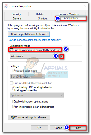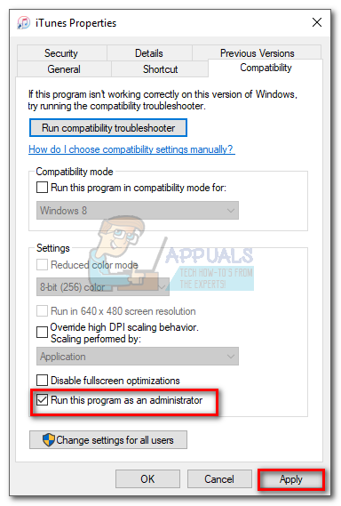If the error message is nowhere to be seen, right-click on the iTunes shortcut and hit Properties. Then, select the Compatibility tab and check the box next to Run this program as an administrator. Hit Apply to save.