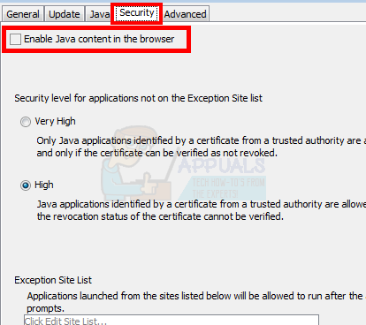 - Uncheck the option Enable Java content in the browser