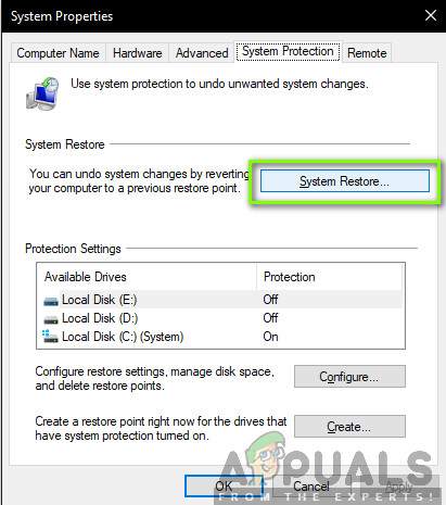 - One in the restore settings, press System Restore present at the beginning of the window under the tab of System Protection.