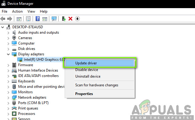 - Click on the Display adapters dropdown to see your installed display card. Right-click on it and select “Update driver”.
