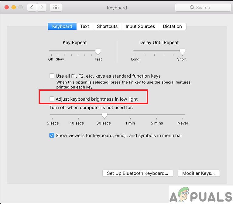 Macbook Ambient Light sensors. - If automatic light-sensing is not working properly you can disable the option to adjust the keyboard brightness automatically. By accessing the keyboard preferences and uncheck the option. You will have to control your backlighting by pressing F5 or F6 for decreasing and increasing the brightness respectively.