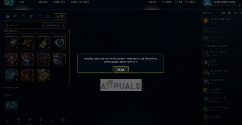 League of Legends often presents users with an Error Code 004 where the client states that patching the game failed. The error message further states that restarting the game might fix the issue. Patching is an act of adding pieces of code to the game to improve gameplay, fix bugs, and introduce new features.