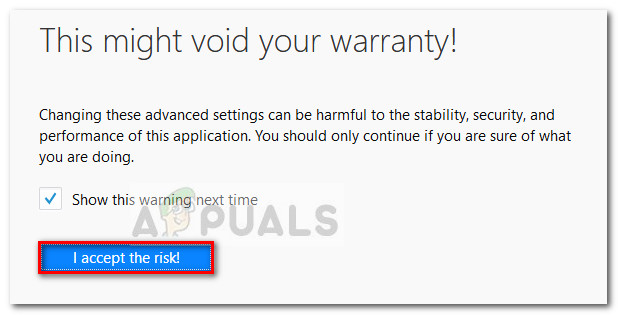 - Click the I accept the risk! button to enter the Advanced Settings of Firefox.
