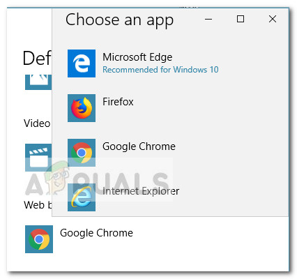 - In the Default apps window, scroll down to the Web browser section and click on the application that is currently set as the default. Next, either select Microsoft Edge or Internet Explorer from the list.