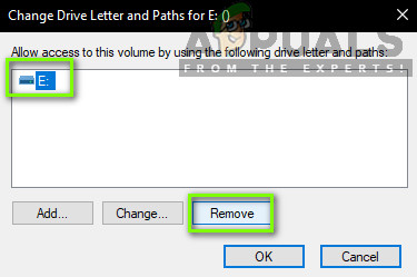 Changing Drive Letter and Paths - Another small window should pop up consisting of the drive name. Select the drive and click on Remove button present underneath.