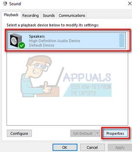 - Navigate to the Playback tab. Select the output device (your speakers) and click on Properties present at the bottom right side of the screen.