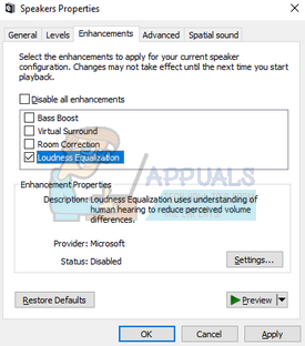 - Once in the properties, navigate to the Enhancements tab. Check the option which says “Loudness Equalization”. Click on Apply to save changes and exit.