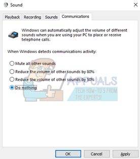 - Once in the Sound properties, navigate to the Communications tab. Select the option of “Do nothing”. Press Apply to save changes and exit.