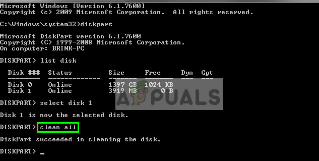 diskpart list disk select disk [disk number of the destination drive] clean all
