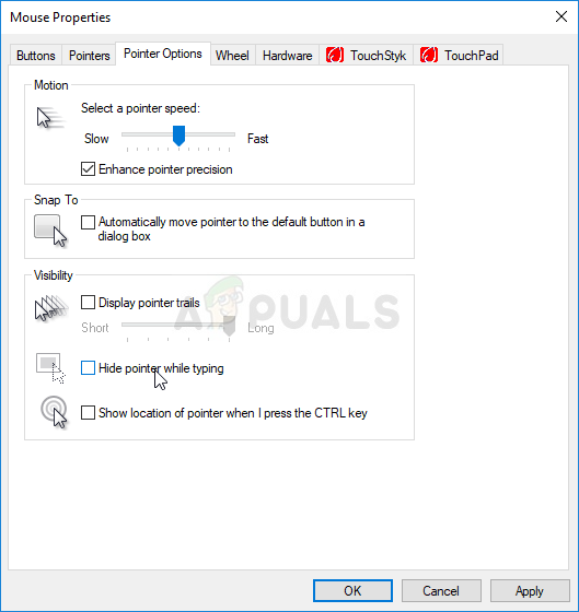 - After the Mouse Properties window opens, navigate to the Pointer Options tab. Under the Visibility section, uncheck the box next to the Hide pointer while typing option.