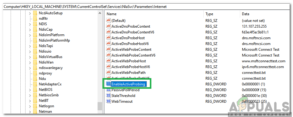- In the right pane, double click on the “EnableActiveProbing” entry.