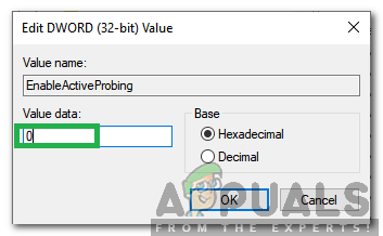 Double clicking on the EnableActiveProbing option - In the “Value Data” option, enter “0” and click on “OK“.