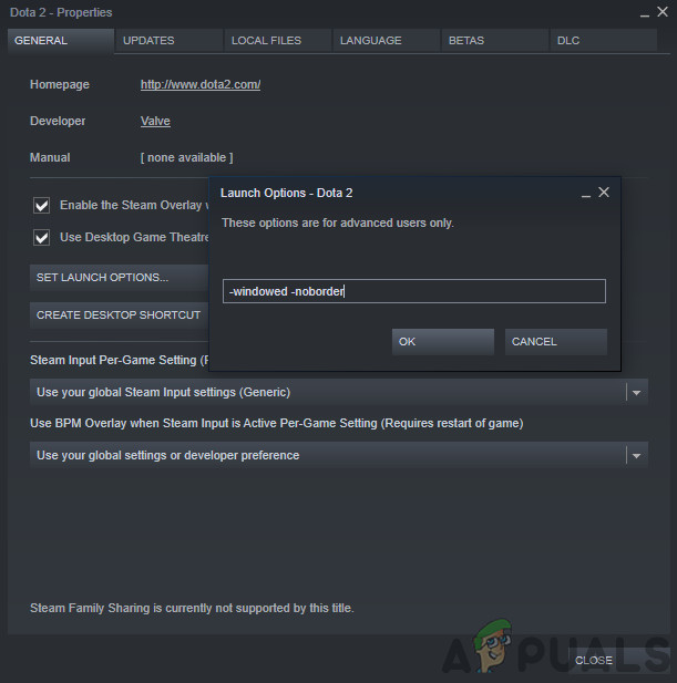 - Set the launch options to “-windowed -noborder”. Press OK to save changes and exit.