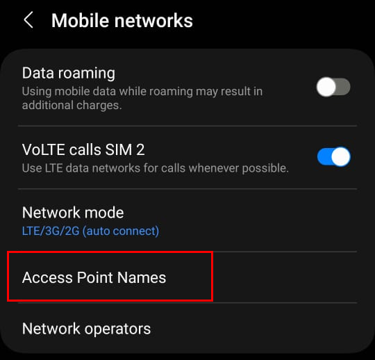 - Within your active data connection settings, tap on Access Point Names.